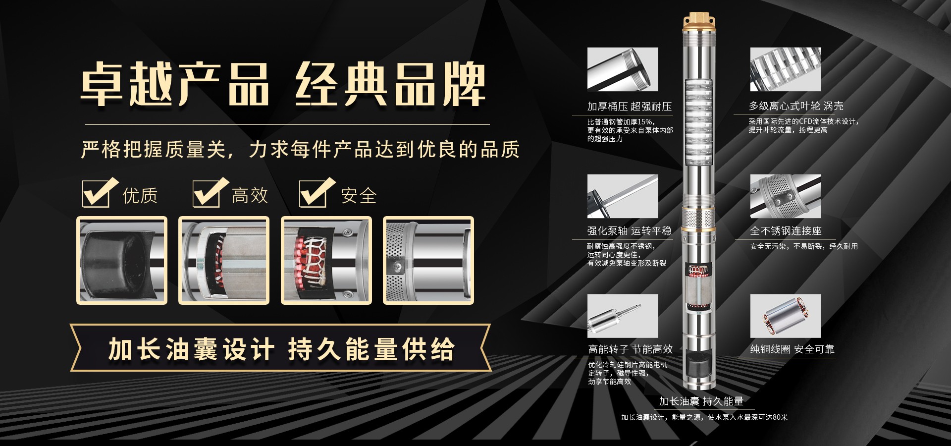 公司始終站在深井泵行業(yè)的前端位置,科研力量、產(chǎn)品和設(shè)備技術(shù)水平均達(dá)到國內(nèi)優(yōu)質(zhì)水平,公司始終堅(jiān)持走科技興企、自主創(chuàng)新的企業(yè)發(fā)展之路,產(chǎn)品不斷推陳出新,可廣泛應(yīng)用于農(nóng)業(yè)灌溉、生活用水、循環(huán)供暖、污水處理、市政供水、石油化工、冶金礦山等領(lǐng)域。